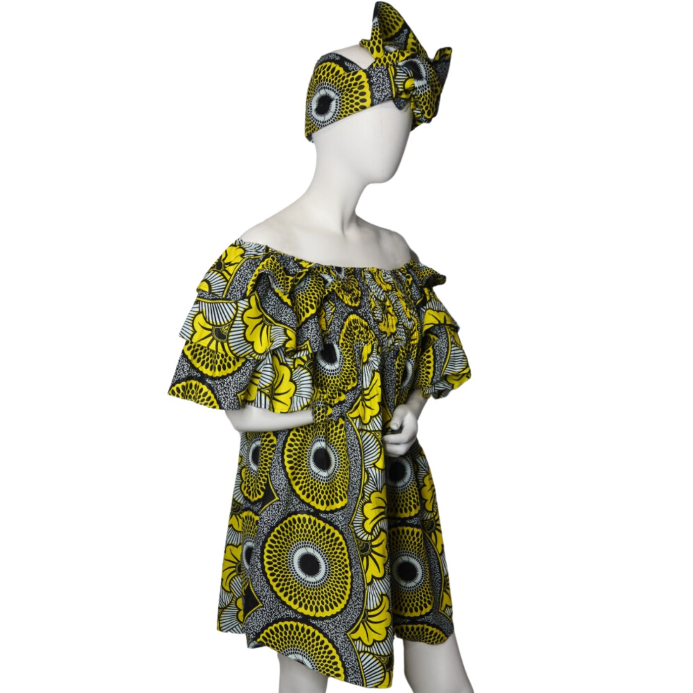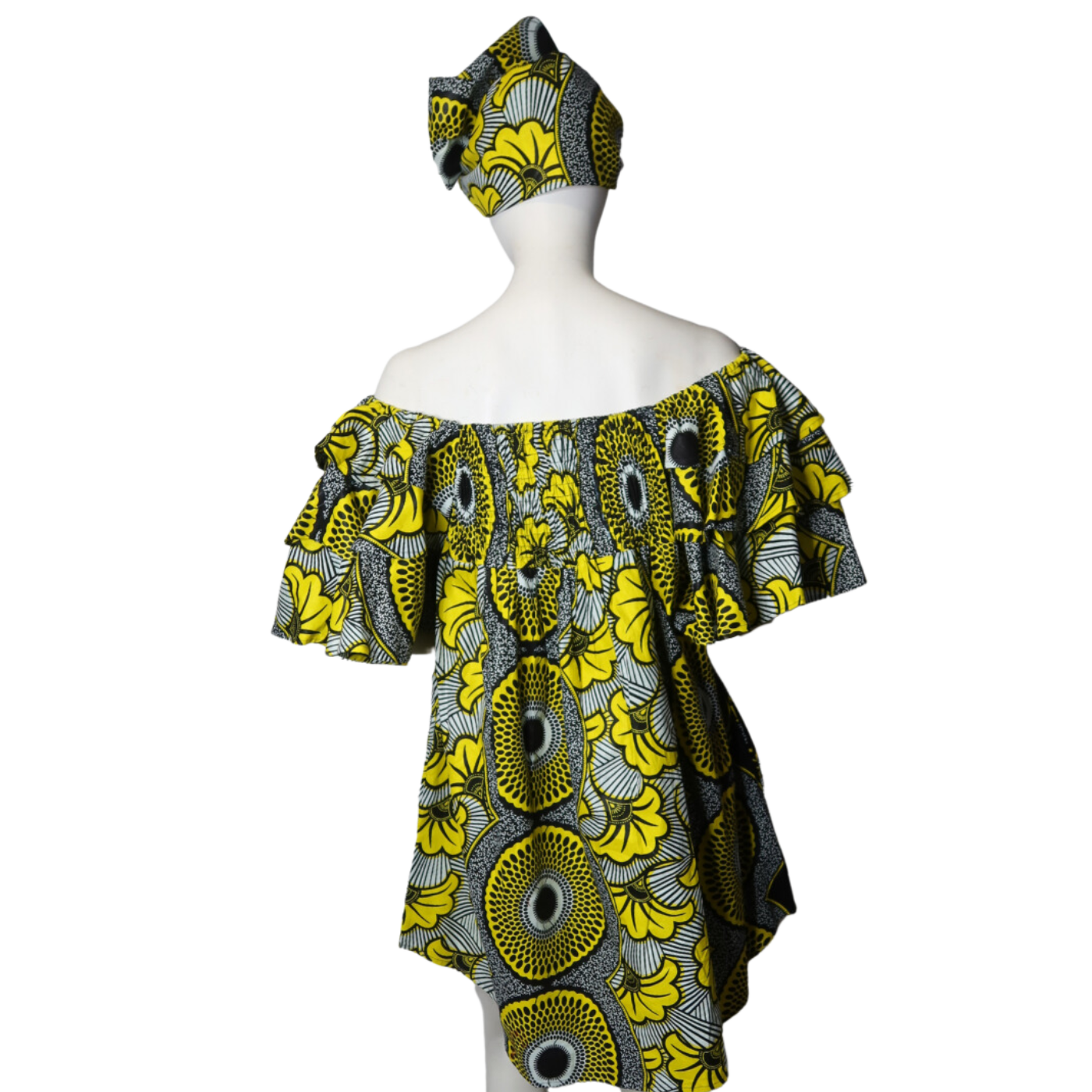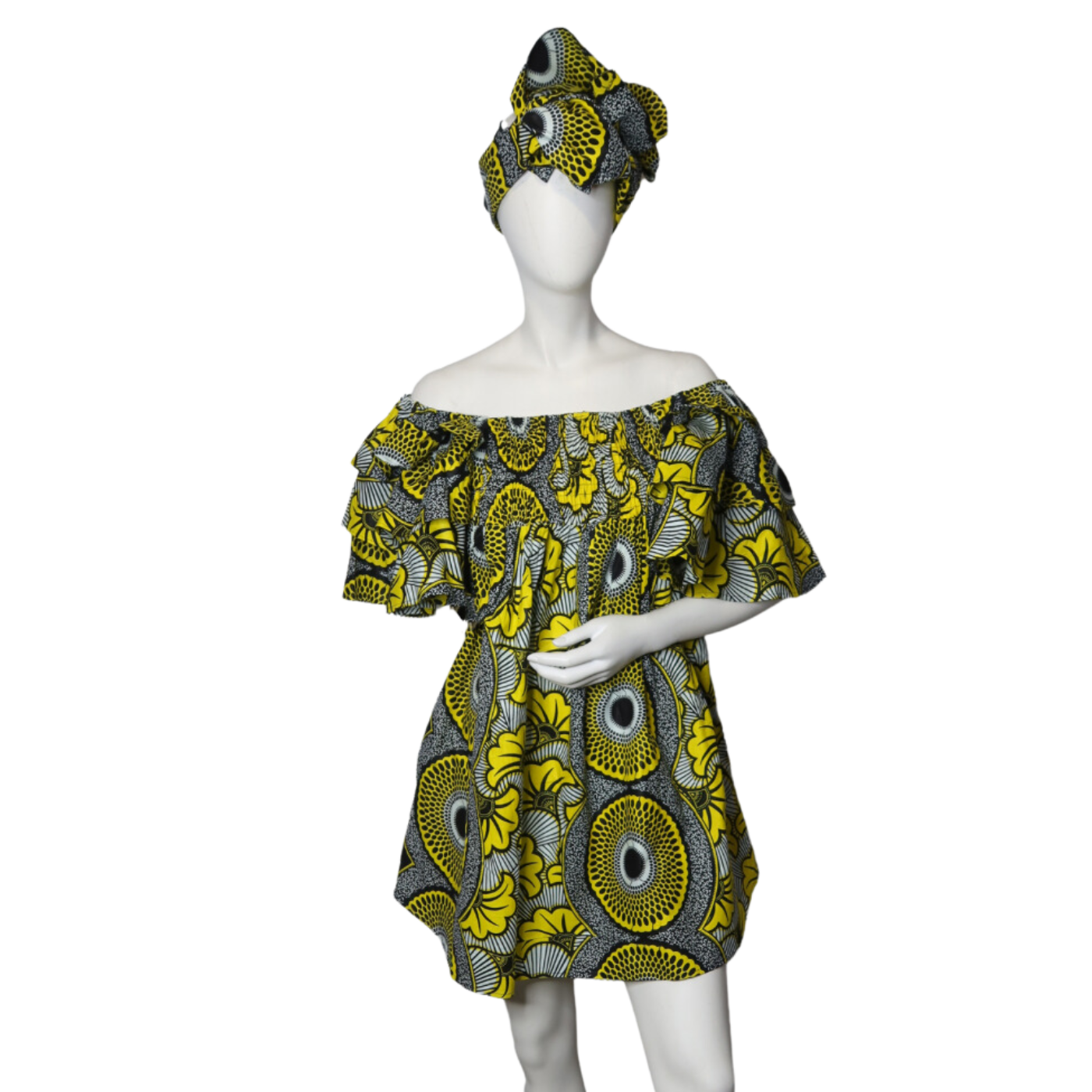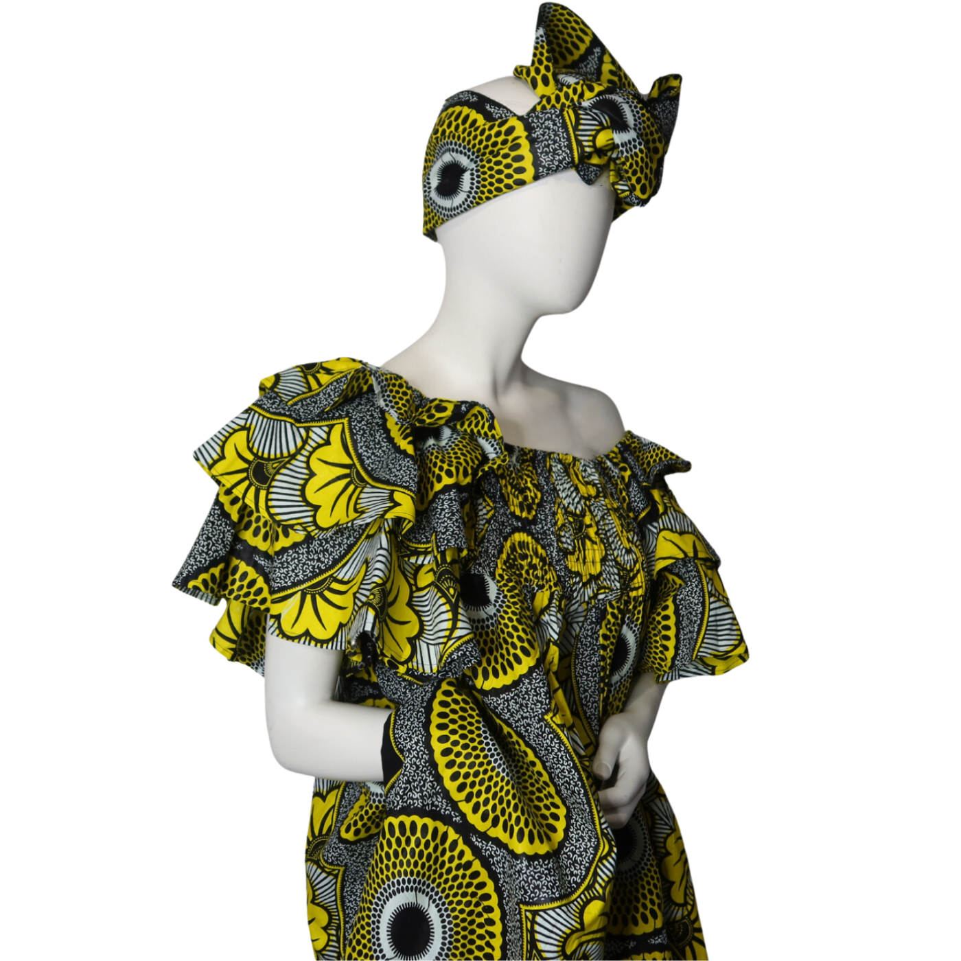 This stylish off-the-shoulder garment combines elegance with practicality. Featuring convenient pockets for your essentials and a matching head scarf, it offers a chic, coordinated look perfect for any occasion. Embrace effortless style and comfort with this versatile ensemble.