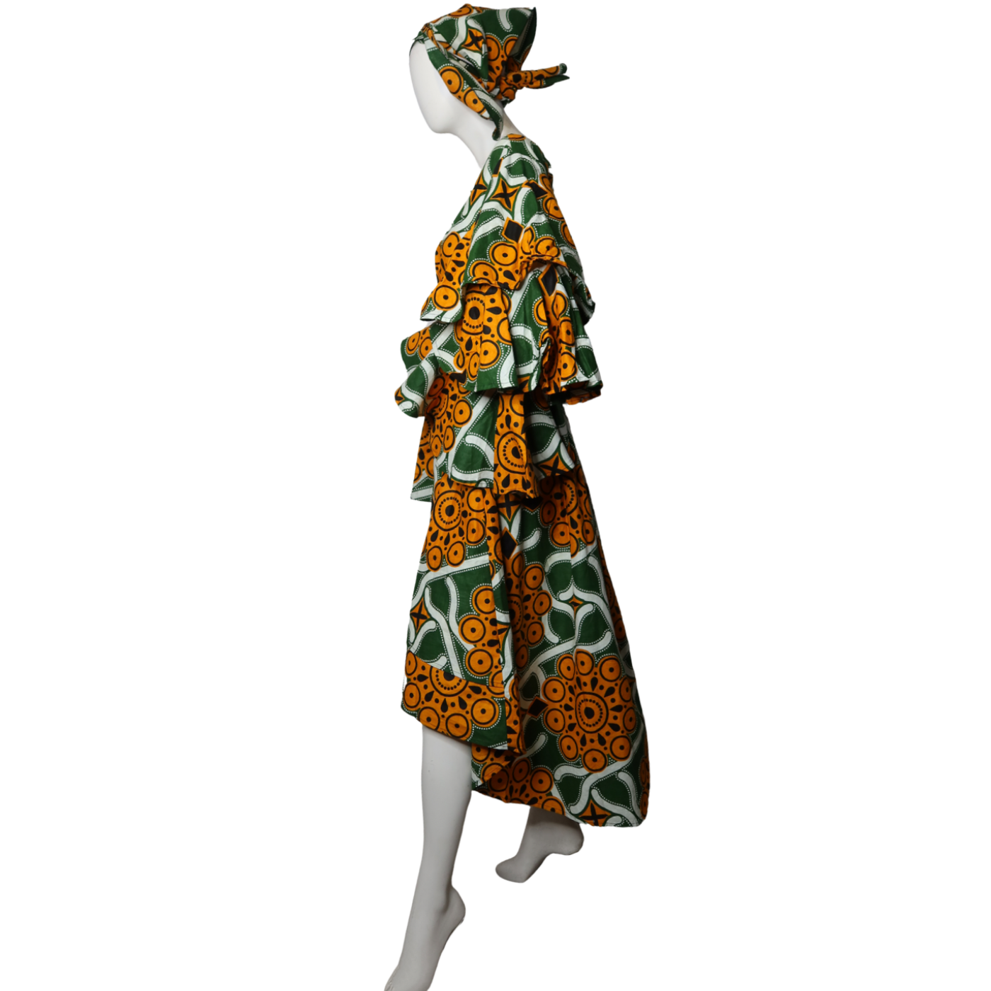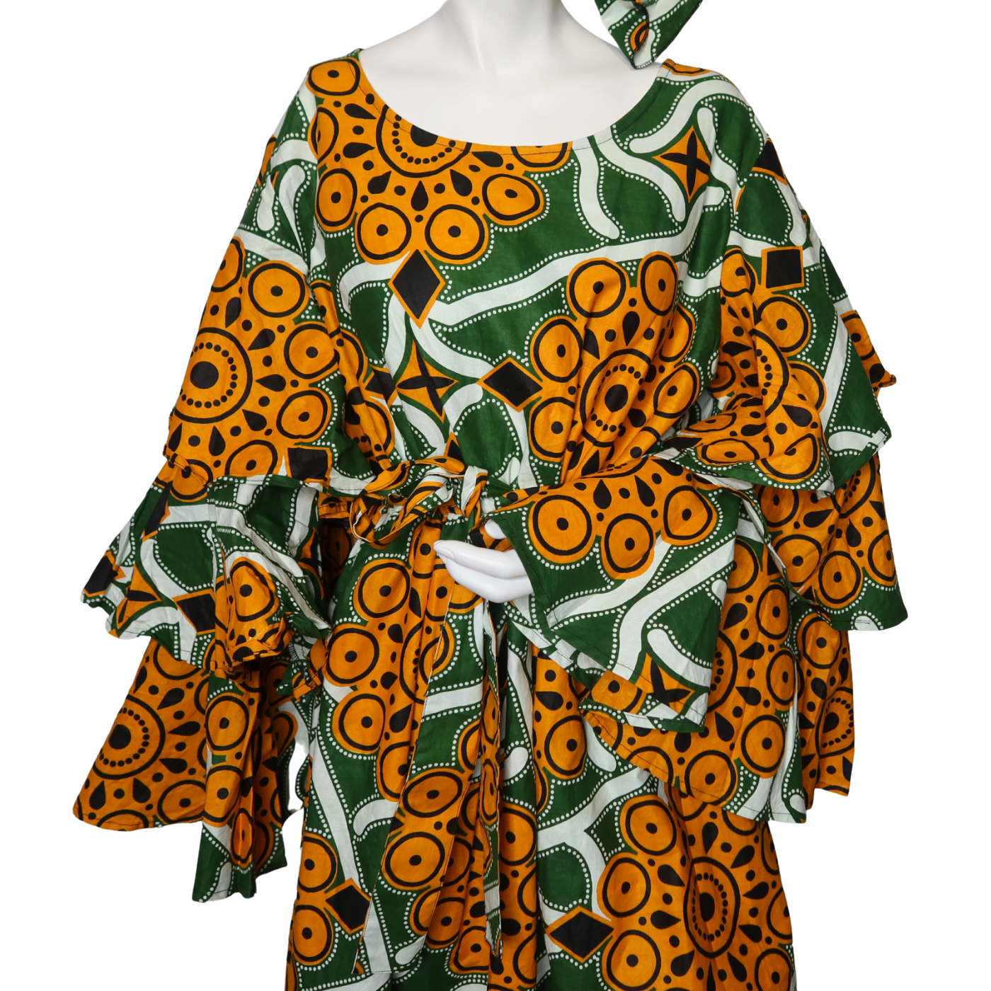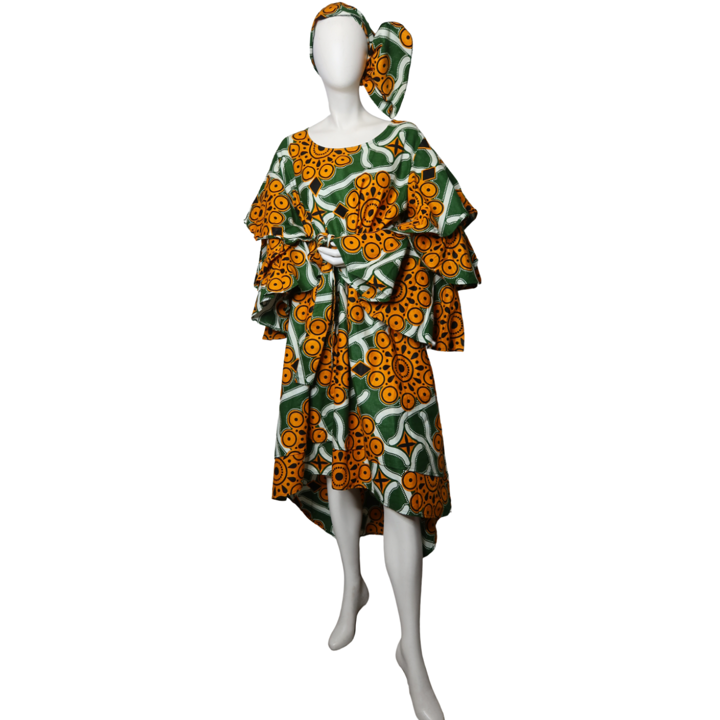 This vibrant high-low dress features festive layered sleeves that add a playful and elegant touch to your look. Paired with a matching head scarf, it creates a coordinated and stylish outfit perfect for celebrations and special occasions.