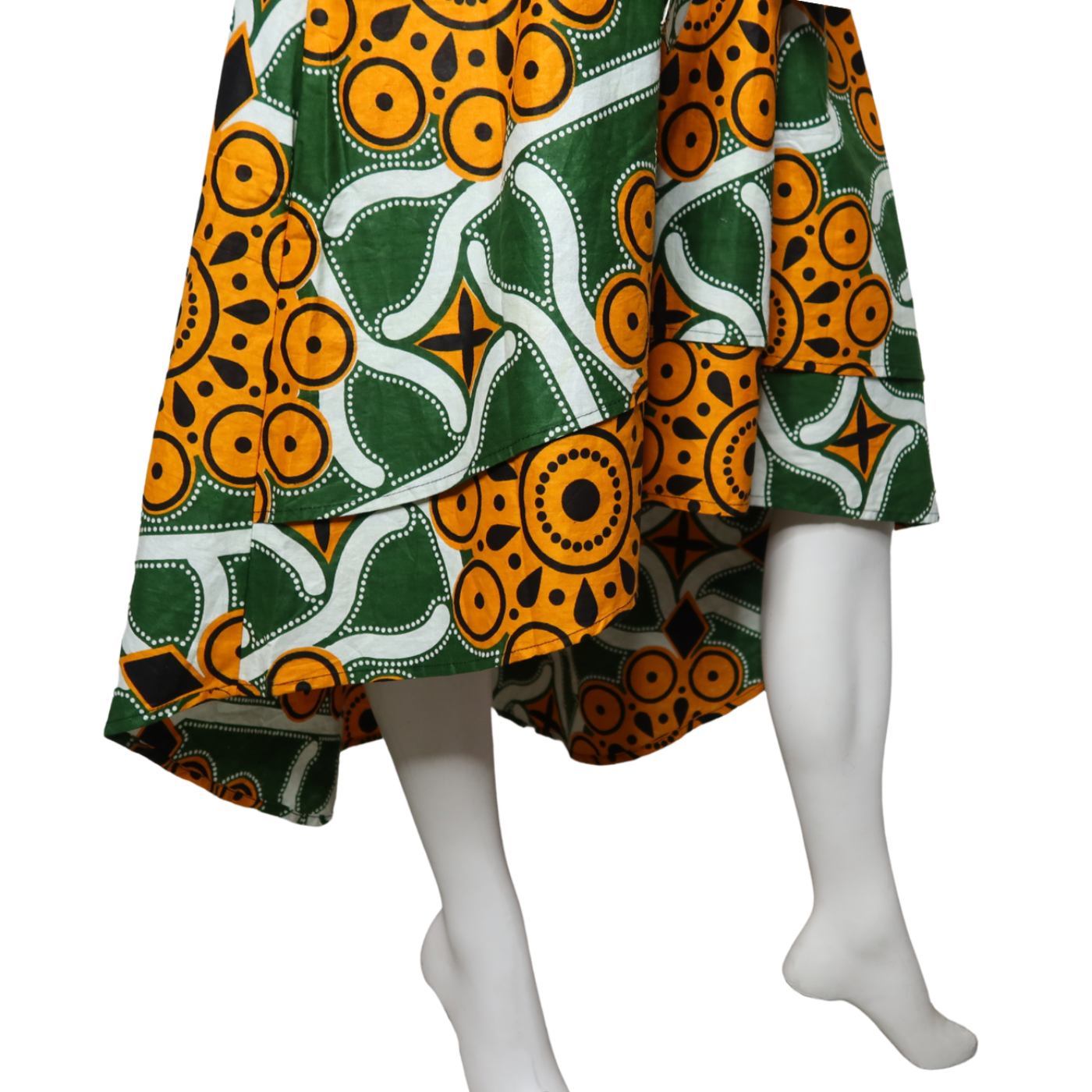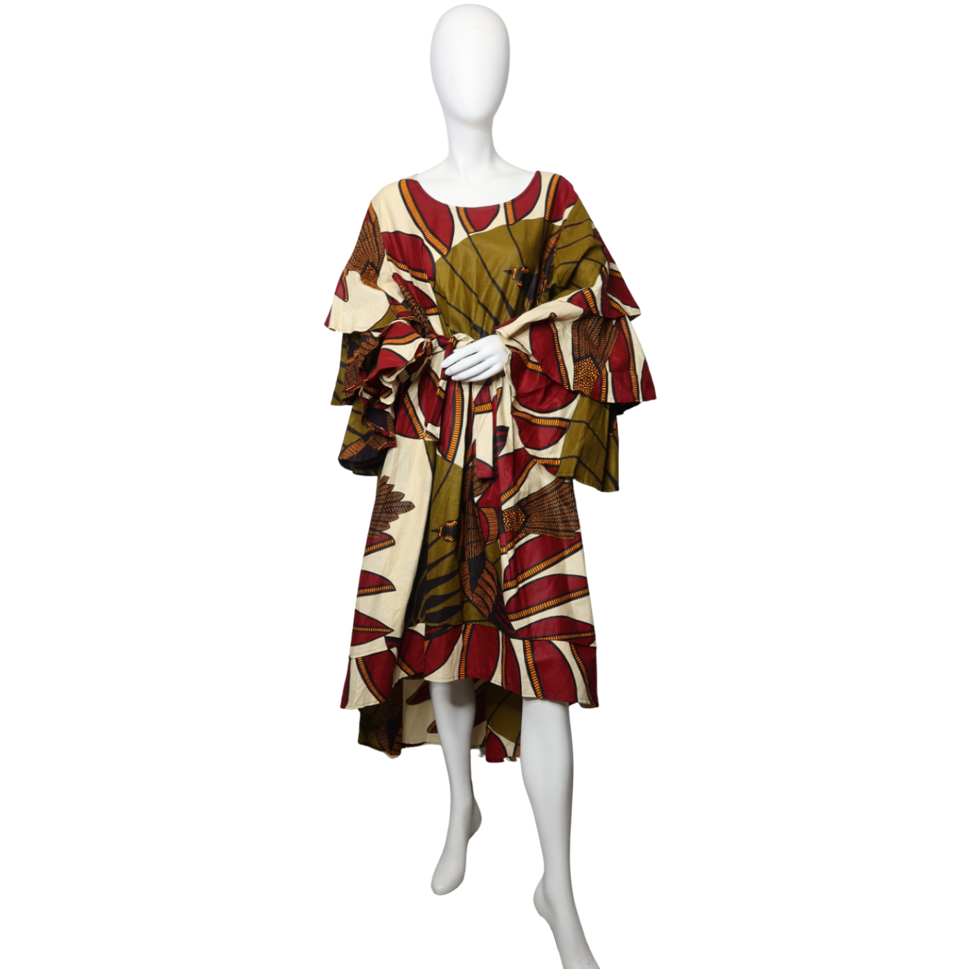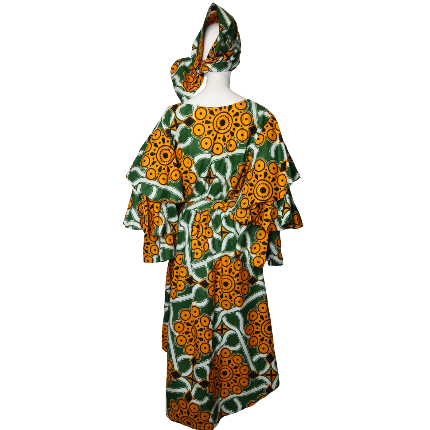 This vibrant high-low dress features festive layered sleeves that add a playful and elegant touch to your look. Paired with a matching head scarf, it creates a coordinated and stylish outfit perfect for celebrations and special occasions.