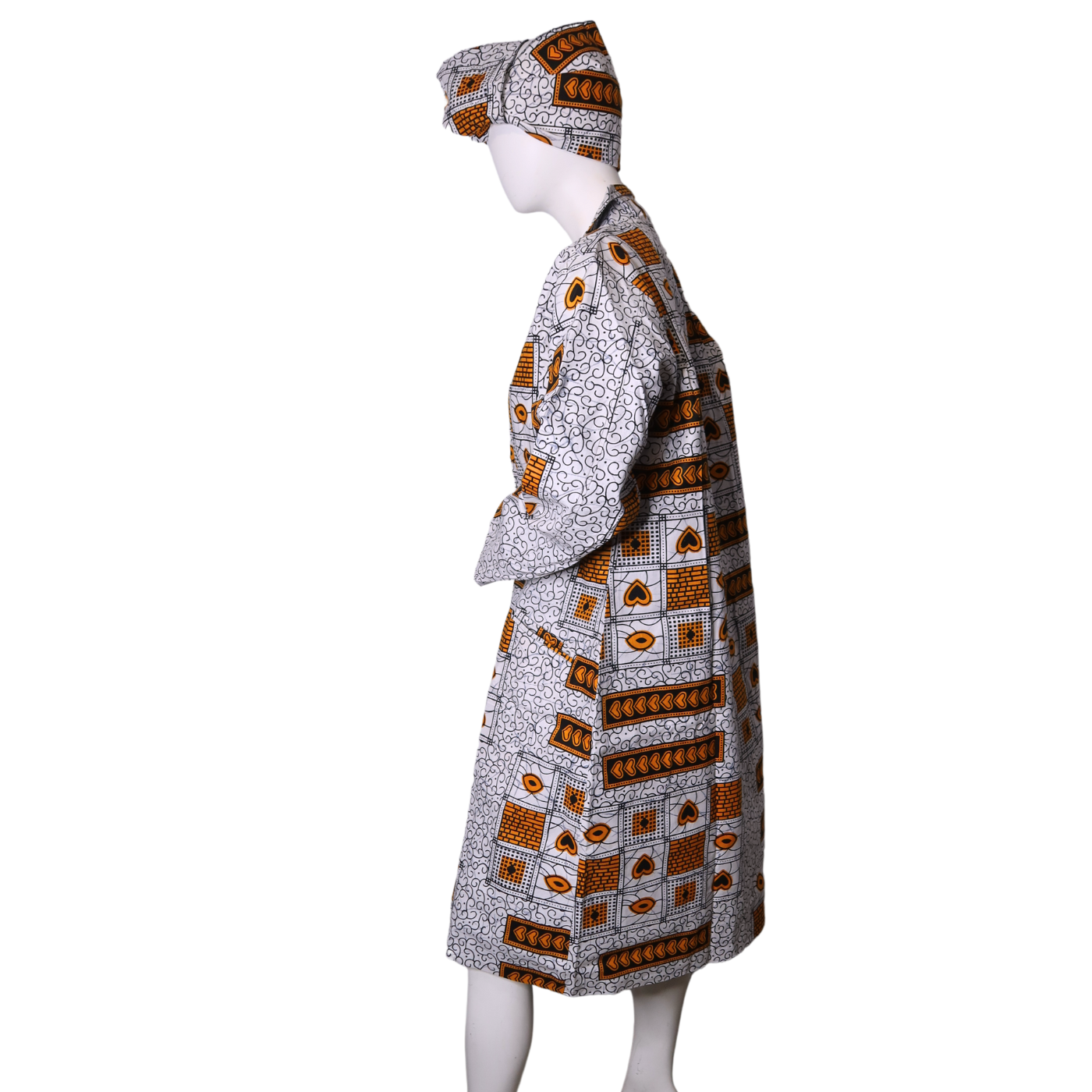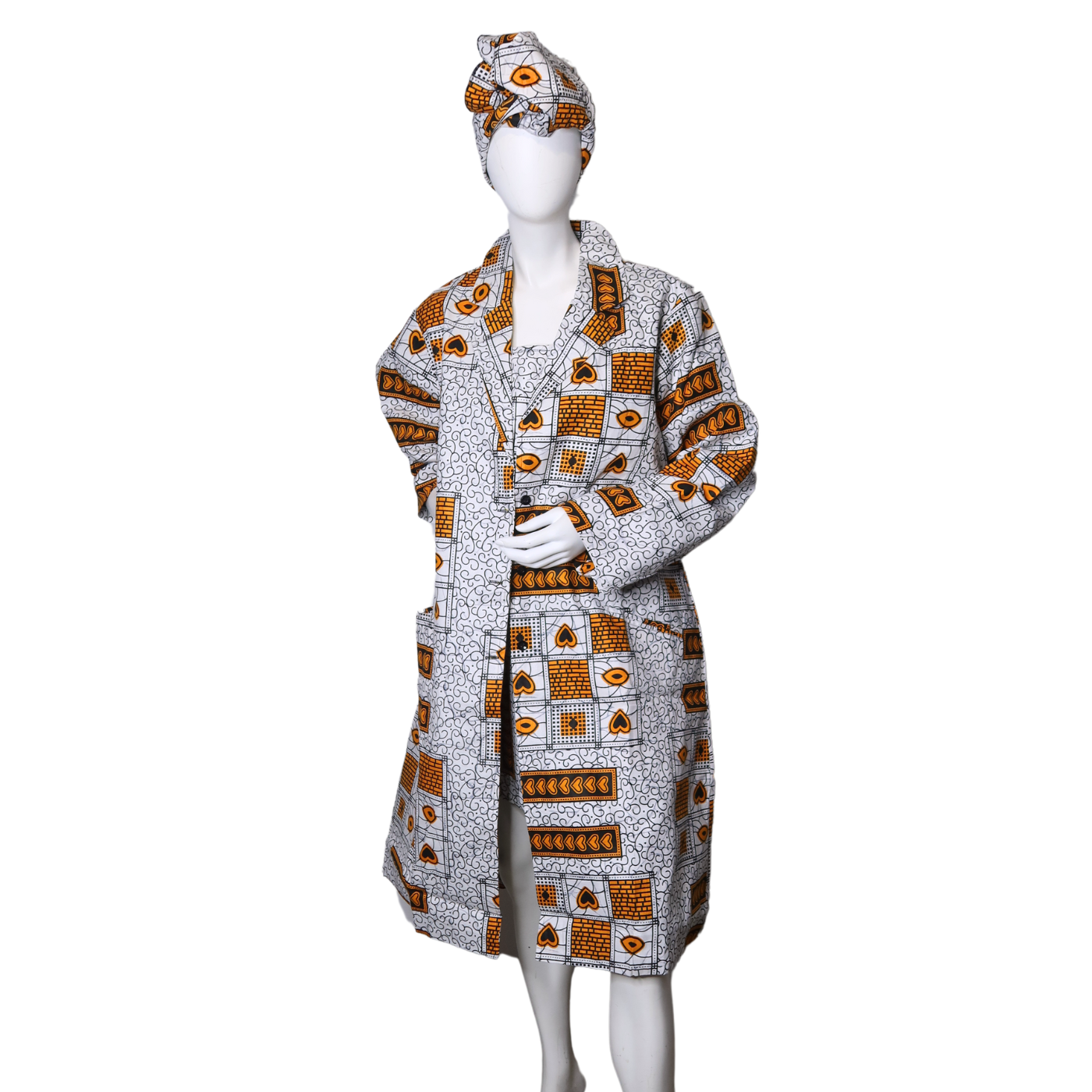 Elevate your style with the Profes Suit, a daring three-piece set designed to make a bold statement. This ensemble features a sleek dress paired with a tailored jacket, perfectly complemented by a matching head wrap. Crafted for confidence and flair, it’s the ultimate choice for those who want to stand out with elegance and edge.