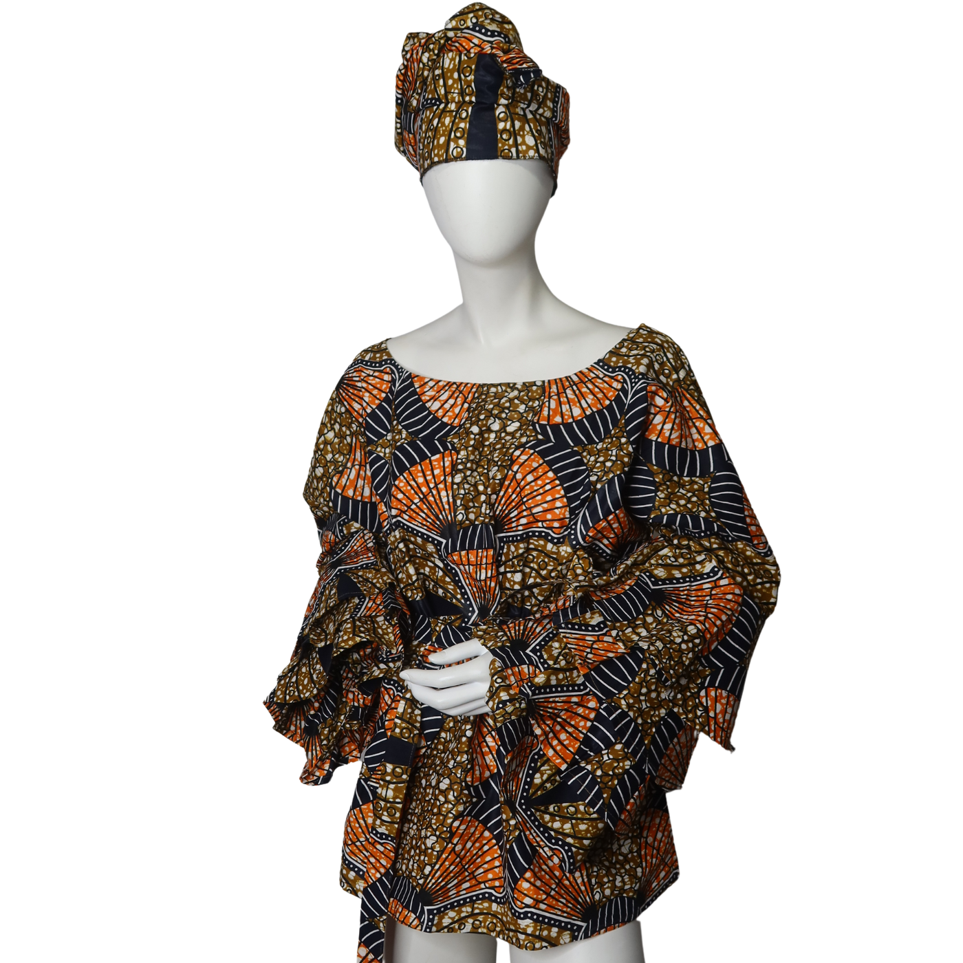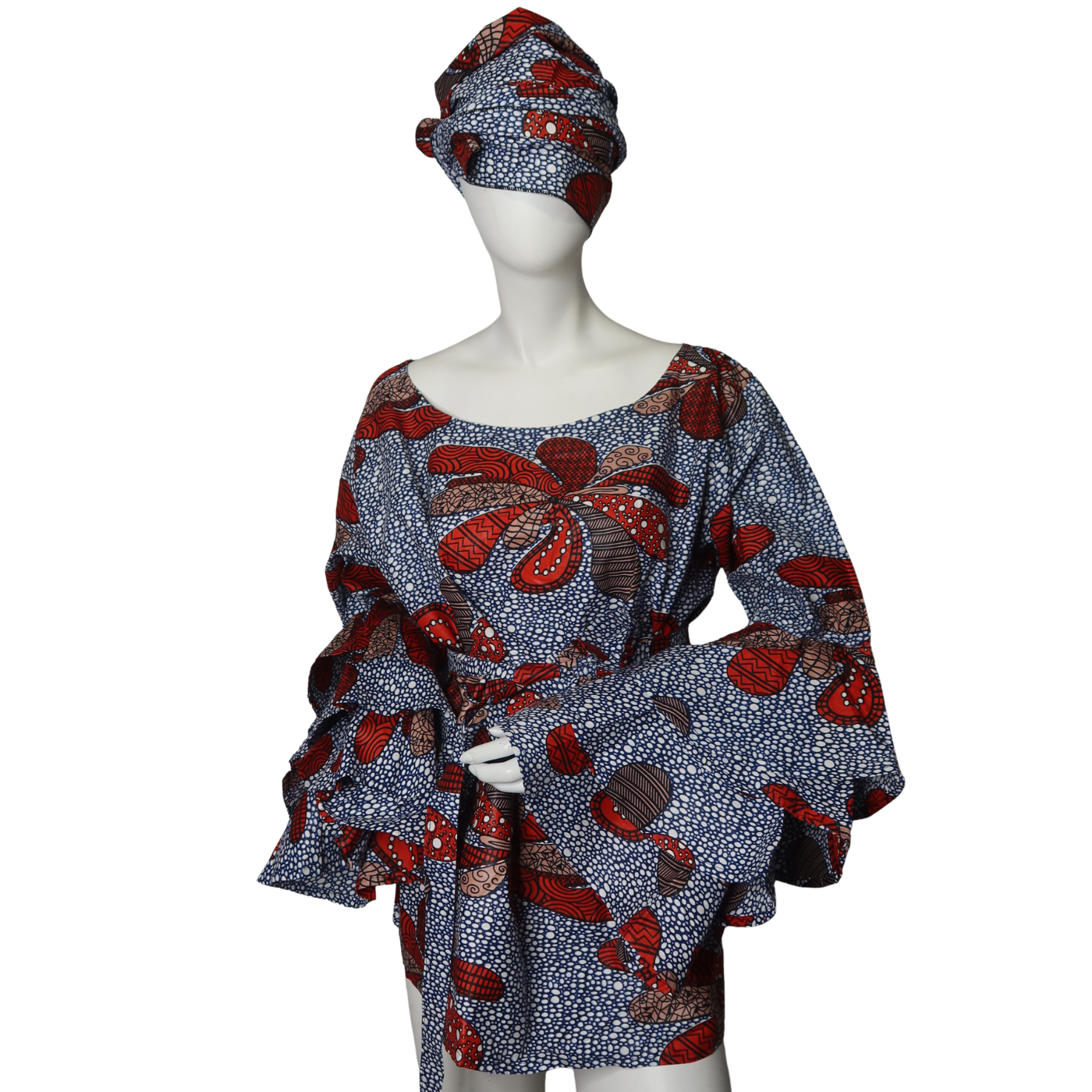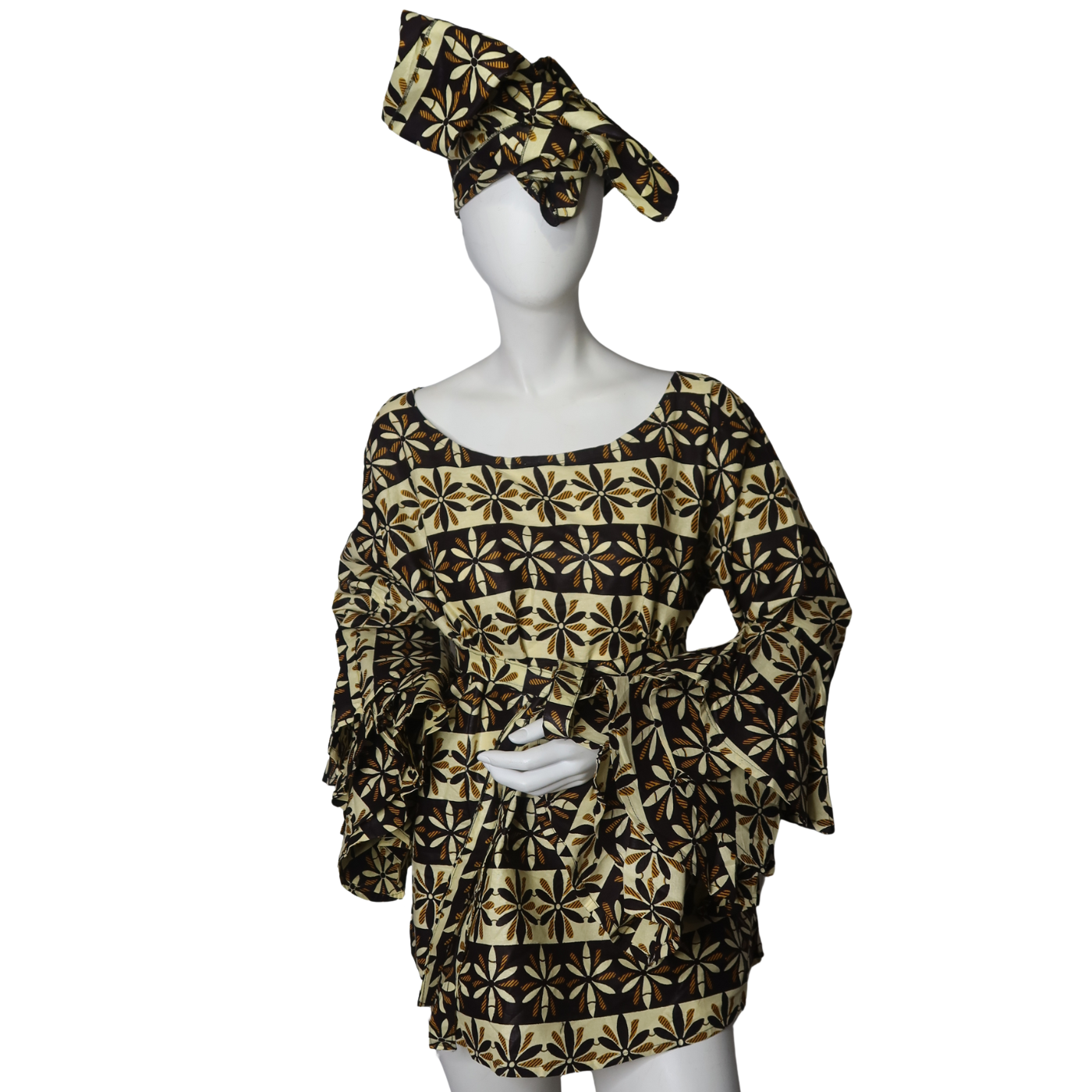 Whitta combines a layered long sleeve top, a stylish head wrap, and a coordinating belt to create a look that inspires confidence.