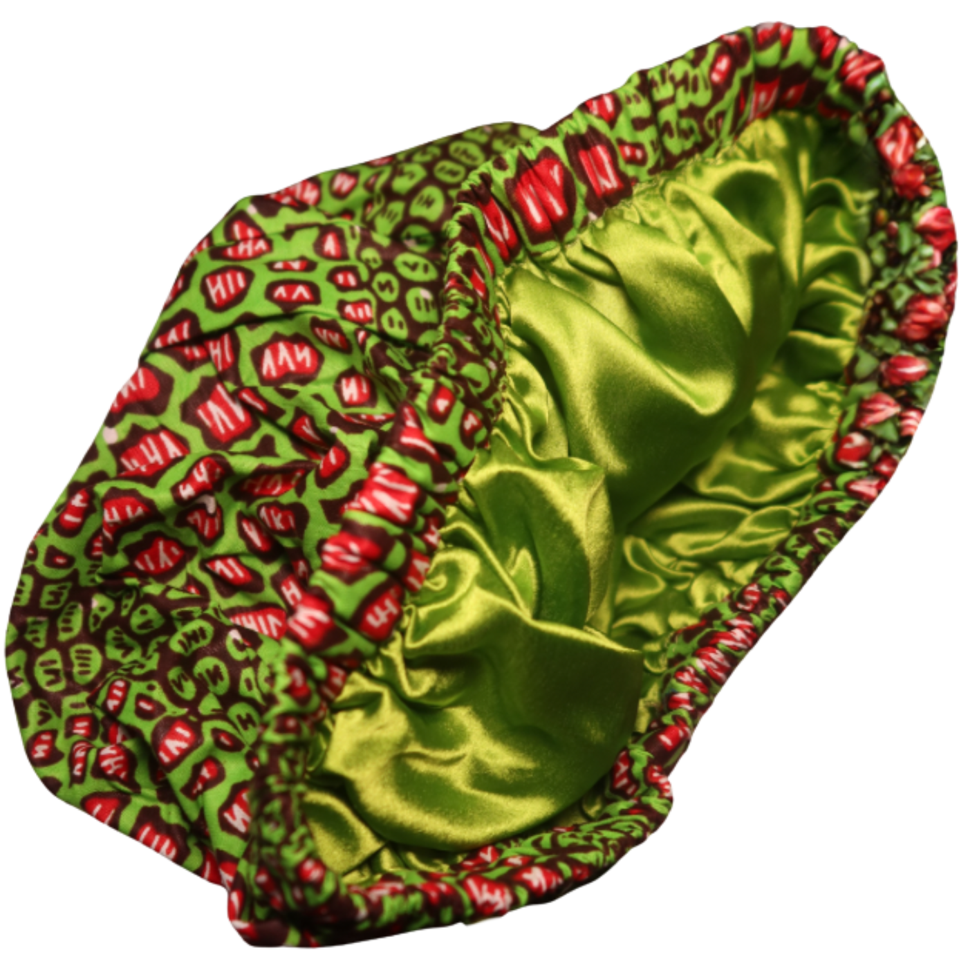 Wrap Tie Bonnet with satin inner lining designed for sleep wear. Features an additional wrap cloth attachment for versatile styling and secure fit. The smooth satin interior protects your hair while you rest.